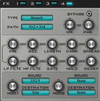 Über LFO 1 wird die Cross-Funktion moduliert, während LFO 1 die Sync-Rate steuert. Letzteres führt zu einem körnigen Klang, da ständig die Delayzeit sprunghaft verändert wird. Beim Hall habe ich die Raumgröße moduliert. Der Hall ist mit Parametern reich gesegnet. Was ich vermisse, ist eine Ducking Funktion, die ihn während des Hits herunterfährt.