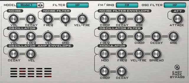 Model 2 basiert auf einer Oszillator-Wellenform mit Hüllkurve, Filter und einem speziellen Modulator, der sich auf die Frequenz und den Klangverlauf auswirkt, ähnlich wie wir es bereits bei der Bassdrum gesehen haben. Außerdem kann eine Frequenz- oder Ringmodulation hinzugeschaltet werden. Die Frequenzmodulation bietet über die Modulator-Parameter harsche bis tonal gefärbte Klänge. Hier habe ich zwischen beiden Varianten über einen externen Controller überblendet: