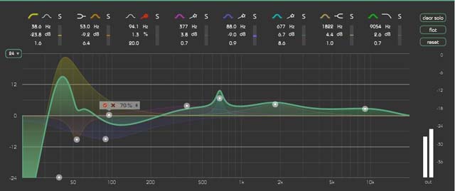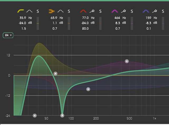 Das Plug-in eignet sich für die Bearbeitung von Subgruppen, Premix und Mastering. Unter den acht Filtern finden sich vier mit Glocken-Charakteristik, flankiert von High- und Low-Shelf- sowie High- und Low-Cut-Filtern. Die letzteren vier bieten alternativ eine Glockencharakteristik. Die Eckfrequenzen der Filter reichen von 20 bis 20.000 Hertz. Jedes Filter kann per Anfasser verschoben werden, und zwar über den gesamten Wirkungsbereich. Alle Filter sind vollparametrisch, arbeiten mit +/- 24 dB und einer extrem weitreichenden Flankensteilheit, die komfortabel per ALT-Taste und Ziehen am Ankerpunkt eingestellt werden kann. Naturgemäß bilden die Cut-Filter insofern eine Ausnahme, als sie nur im negativen Bereich, also von 0 bis -24 dB wirken.
