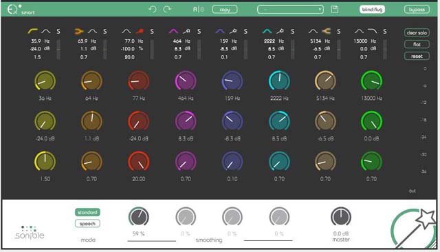 Man kann die vier Glockenfilter in einen Lernbetrieb versetzen, nach dem sie eine Optimierung des Frequenzgangs vorschlagen. Hier sehen Sie zum einen die Taster für den herkömmlichen und den Speech-Modus, daneben einen der vier Smooth-Regler. (Mit Hilfe der Smooth-Regler kann man die nach Abschluß des Lernens hochauflösende, unter Umständen recht eckig wirkende Kurve in den Teilbereichen, für die die vier mittleren Filter zuständig sind, glätten.)